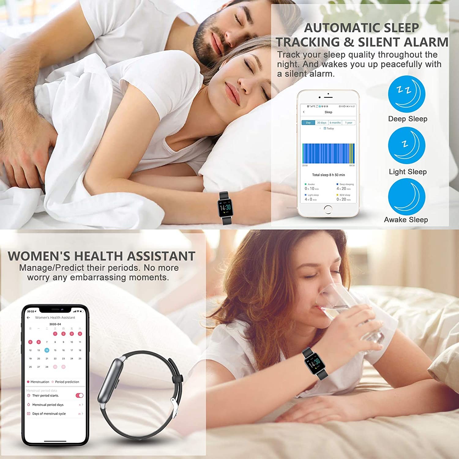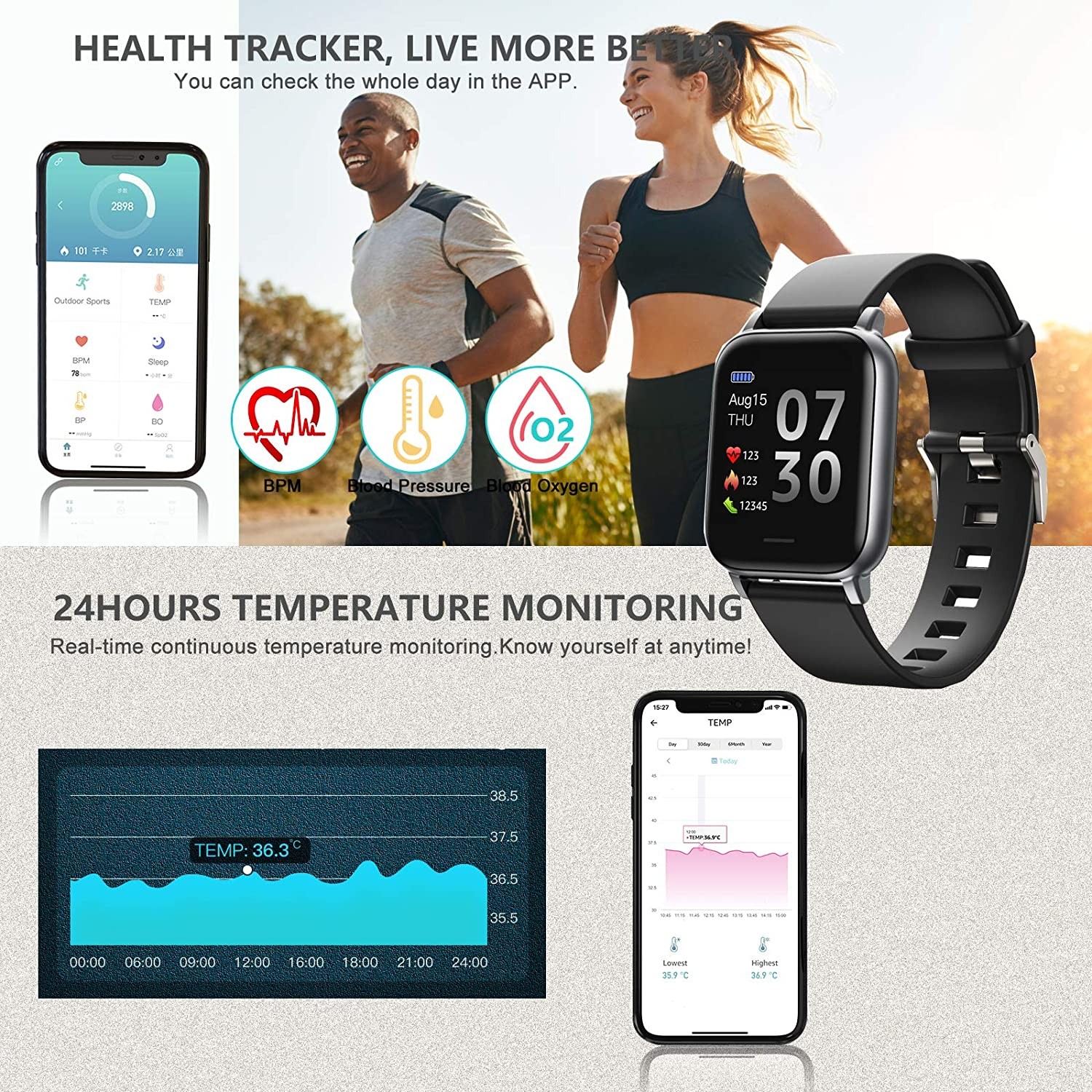 【خذ توقعاتك أكثر من اللازم touch يتميز بشاشة لمس كبيرة بحجم 1.3 بوصة تتيح لك فهم صحتك بشكل حدسي من خلال عرض بياناتك الرياضية بوضوح وبطريقة يسهل فهمها. يمكنك التحقق من قياس درجة الحرارة ومعدل ضربات القلب وضغط الدم ومساعد صحة المرأة ومسار النوم في أي وقت. وإنشاء تقارير في التطبيق لمساعدتك على تحليل حالتك الجسدية ونوعية نومك. كن صديقك الأكثر مراعاة لك ، تحقق من صحتك على مدار 24 ساعة في اليوم.