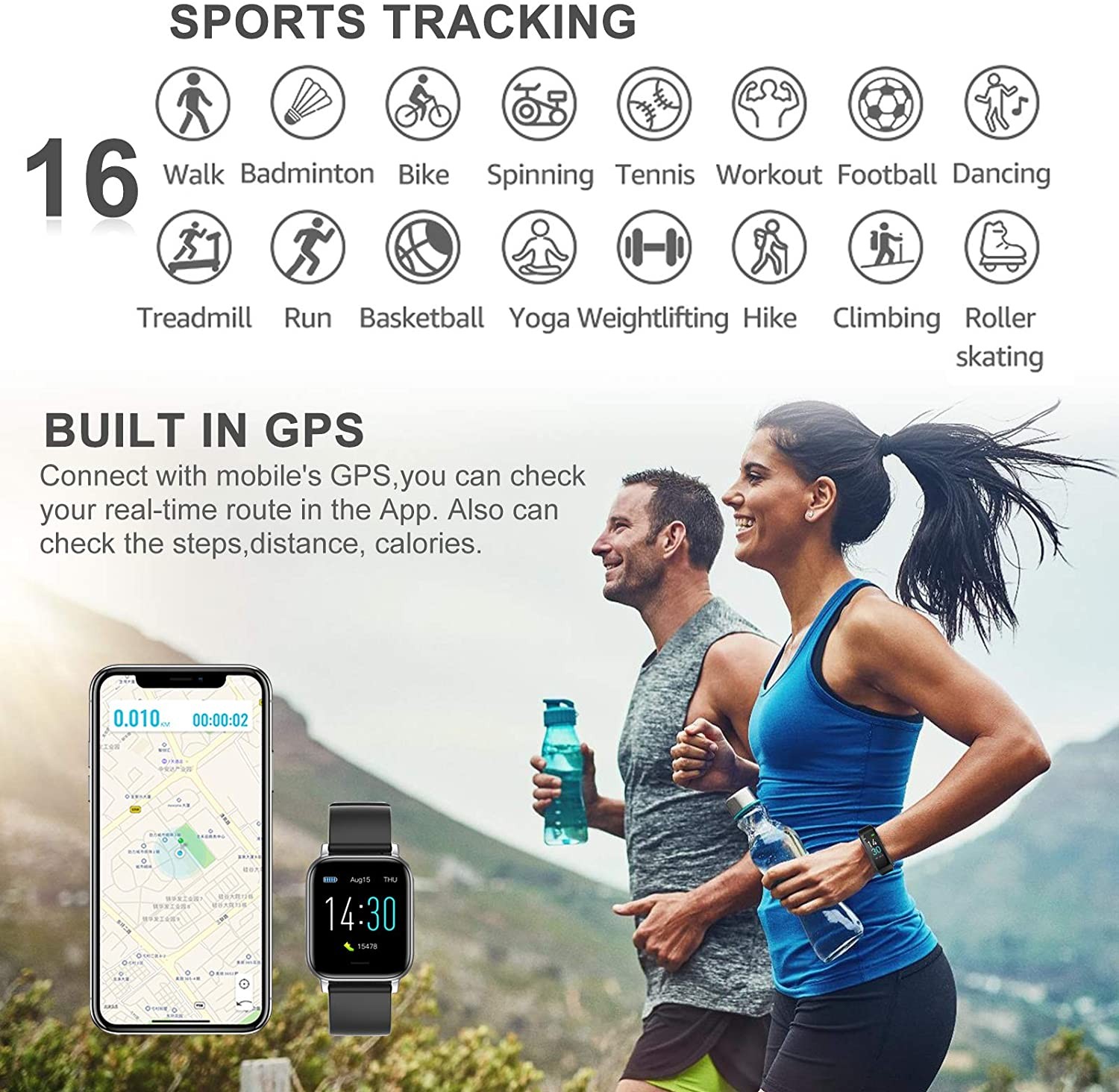 【متتبع دقيق للياقة will سيتتبع متعقب النشاط هذا خطواتك اليومية والمسافة وحرق السعرات الحرارية لتسجيل عملية لياقتك ، مما يساعدك على تحقيق الأهداف كما هو مخطط لها. تواصل مع نظام تحديد المواقع العالمي للهاتف المحمول ، يمكنك التحقق من مسارك في الوقت الفعلي في التطبيق. كما أنه يدعم 16 وضعًا لتتبع التمرينات المتعددة مثل السباحة ، والأماكن المغلقة في الهواء الطلق (دورة ، والجري ، والمشي) ، والدراجة الثابتة ، والليبتيكال ، والمشي لمسافات طويلة ، واليوغا ، وما إلى ذلك ، يمكنه تتبع جميع طرق التمرين ، والمسافات ، والحالة البدنية أثناء التمرين. ابق متحمسًا طوال اليوم!