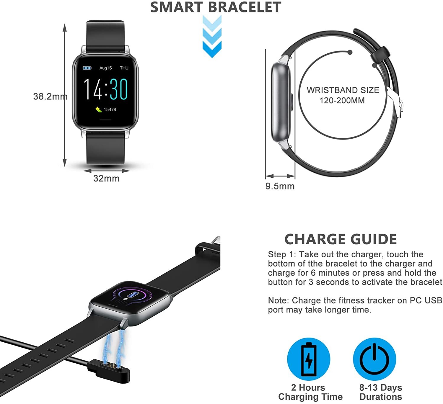 【بطارية تدوم طويلاً وشحن USB استمتع بالطاقة لمدة 8-14 يومًا بشحنة واحدة و 45 يومًا في وضع الاستعداد مع ساعتين فقط من الشحن اللاسلكي عبر USB وهو مريح للغاية للتوصيل بمحول الشحن أو منفذ USB للكمبيوتر الشخصي.