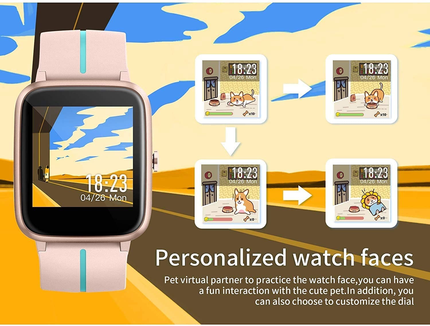 【شاشة 1.3 بوصة و 5 ATM مقاومة للماء شاشة ملونة عالية الدقة تعمل باللمس مقاس 1.3 بوصة مع غلاف معدني توفر جودة صورة ممتازة وتجربة بصرية. بالإضافة إلى القرصين والأقراص المخصصة على الساعة ، يوجد أيضًا قرص للحيوانات الأليفة الذي يسمح لك بإطعام حيوانك الأليف عن طريق التمرين اليومي. يدعم التصنيف المقاوم للماء 5ATM السباحة والاستحمام بالماء البارد ، كما يتميز أيضًا بوضع السباحة الذي يراقب الوقت والمسافة والسعرات الحرارية وأرقام الرحلات وموقع السباحة و SWOLF وغيرها من البيانات.